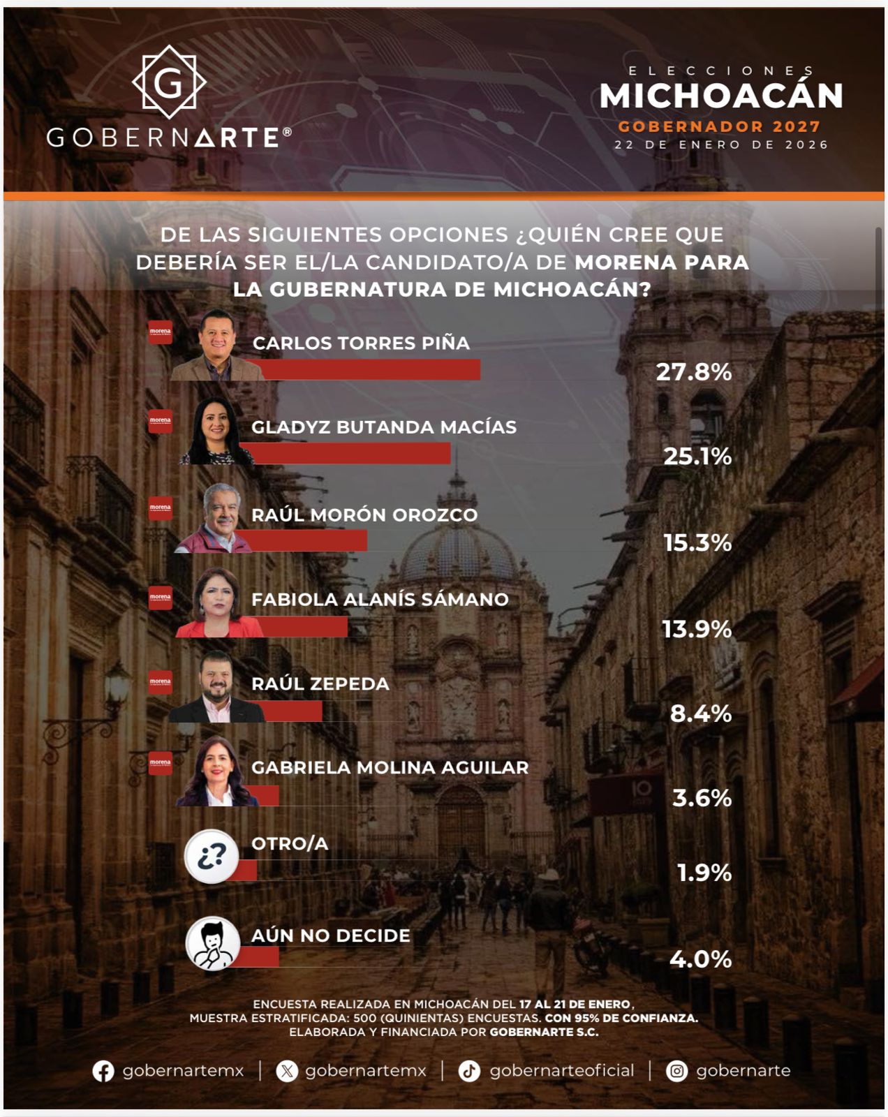 Así lo revela un estudio de Gobernarte, cuyos resultados le dan a Gladyz Butanda Macías 25.1 puntos, seguida del senador Raúl Morón, con 15.3 por ciento; la diputada Fabiola Alanís Sámano, con 13.9 por ciento; el secretario de Gobierno, Raúl Zepeda Villaseñor, con 8.4 por ciento, y la secretaria de Educación en el Estado, Gabriela Molina Aguilar, quien apenas suma 3.6 puntos.