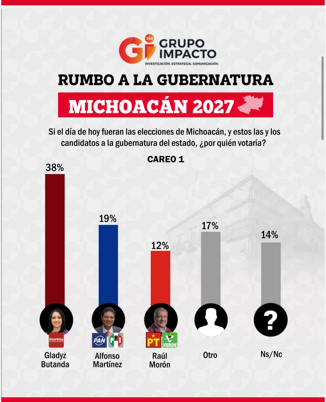 A estos les sigue el senador Raúl Morón Orozco con apenas 12 puntos, bajo el siglado del Partido del Trabajo y Verde Ecologista de México, aunque ambos partidos políticos han promovido ya sus cartas para 2027 y ninguna de ellas incluye al senador, cuyo partido, Morena, tampoco lo ha considerado.