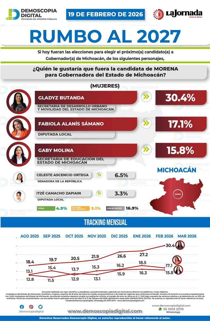 Con 30.4 puntos de respaldo popular, la arquitecta Gladyz Butanda Macías se posiciona como la aspirante a la candidatura de Morena por la gubernatura de Michoacán con mayores posibilidades de triunfo en las elecciones de 2027.
