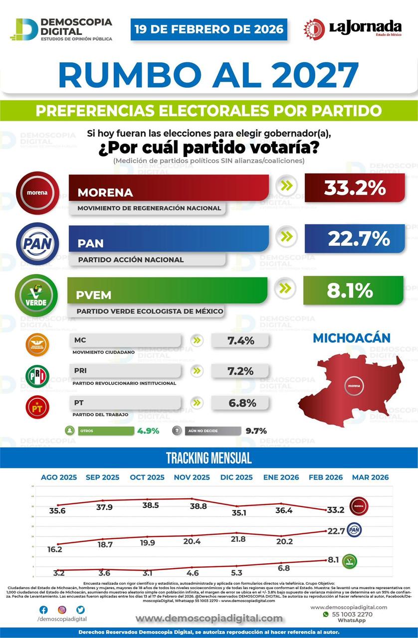 Ante este escenario, la arquitecta se proyecta como la próxima gobernadora de Michoacán, tomando en cuenta que Morena mantiene una preferencia electoral de 33.2 por ciento, muy por encima de su rival más próximo, el PAN, que apenas suma 22.7 por ciento.