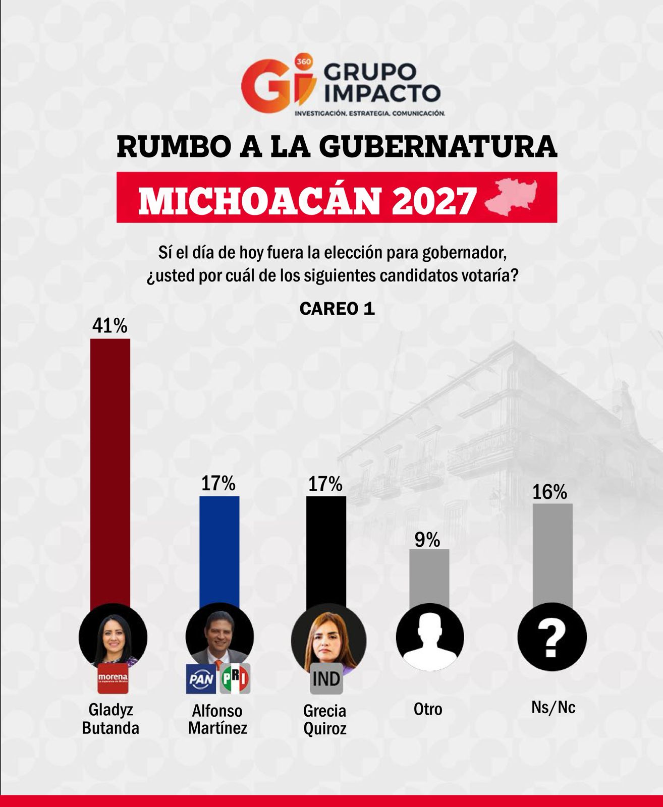 El estudio indica que Butanda tiene el 41 % de intención de voto en un careo con el alcalde moreliano Alfonso Martínez, quien registra 17 %, y la presidenta sustituta de Uruapan, Grecia Quiroz, también 17 %.