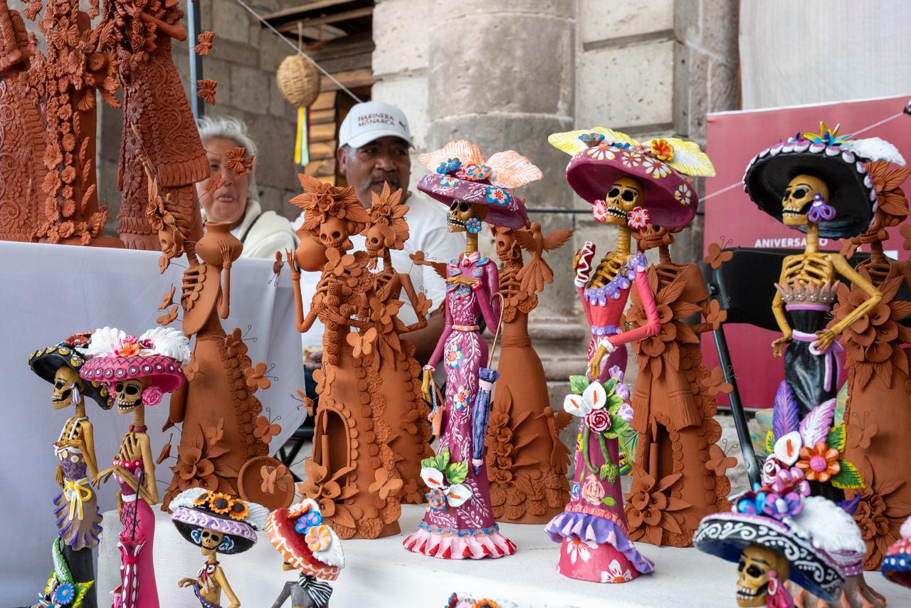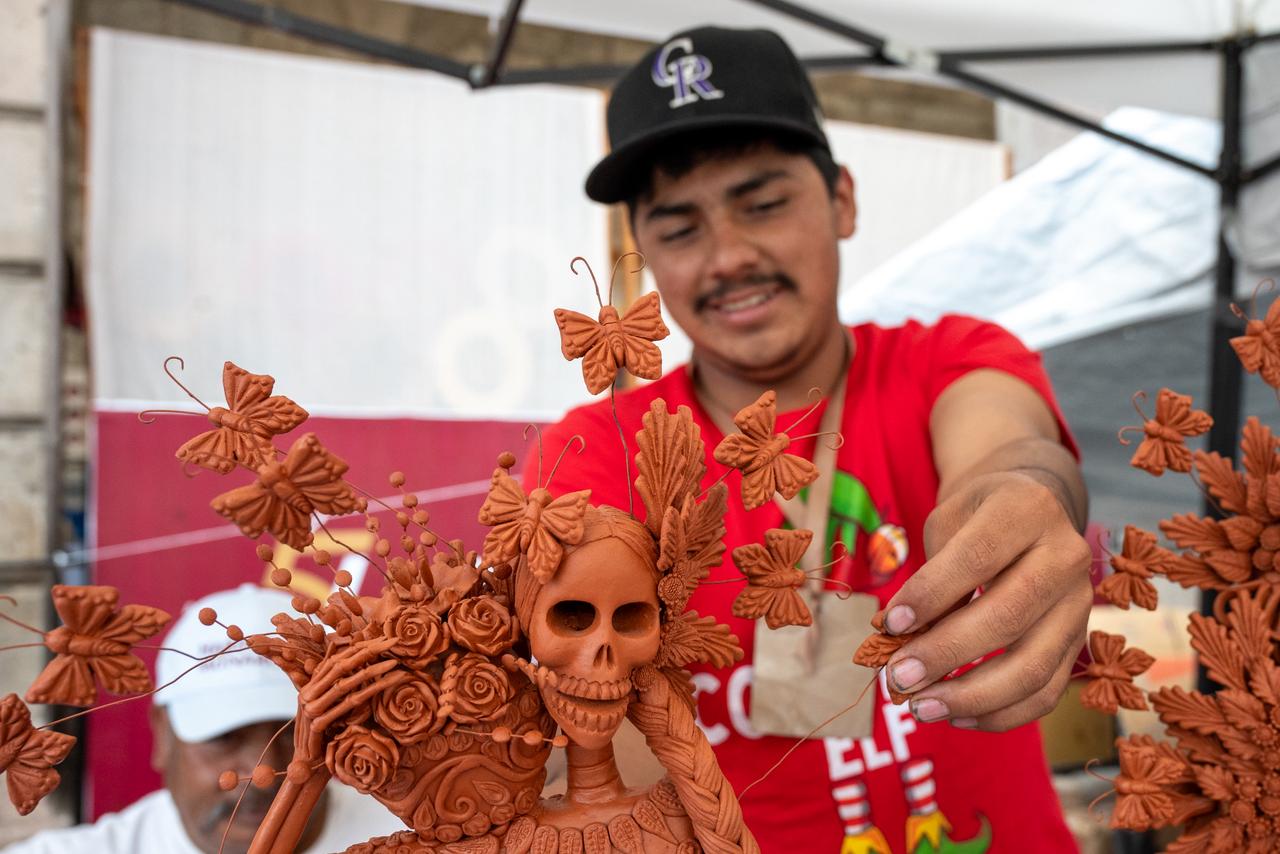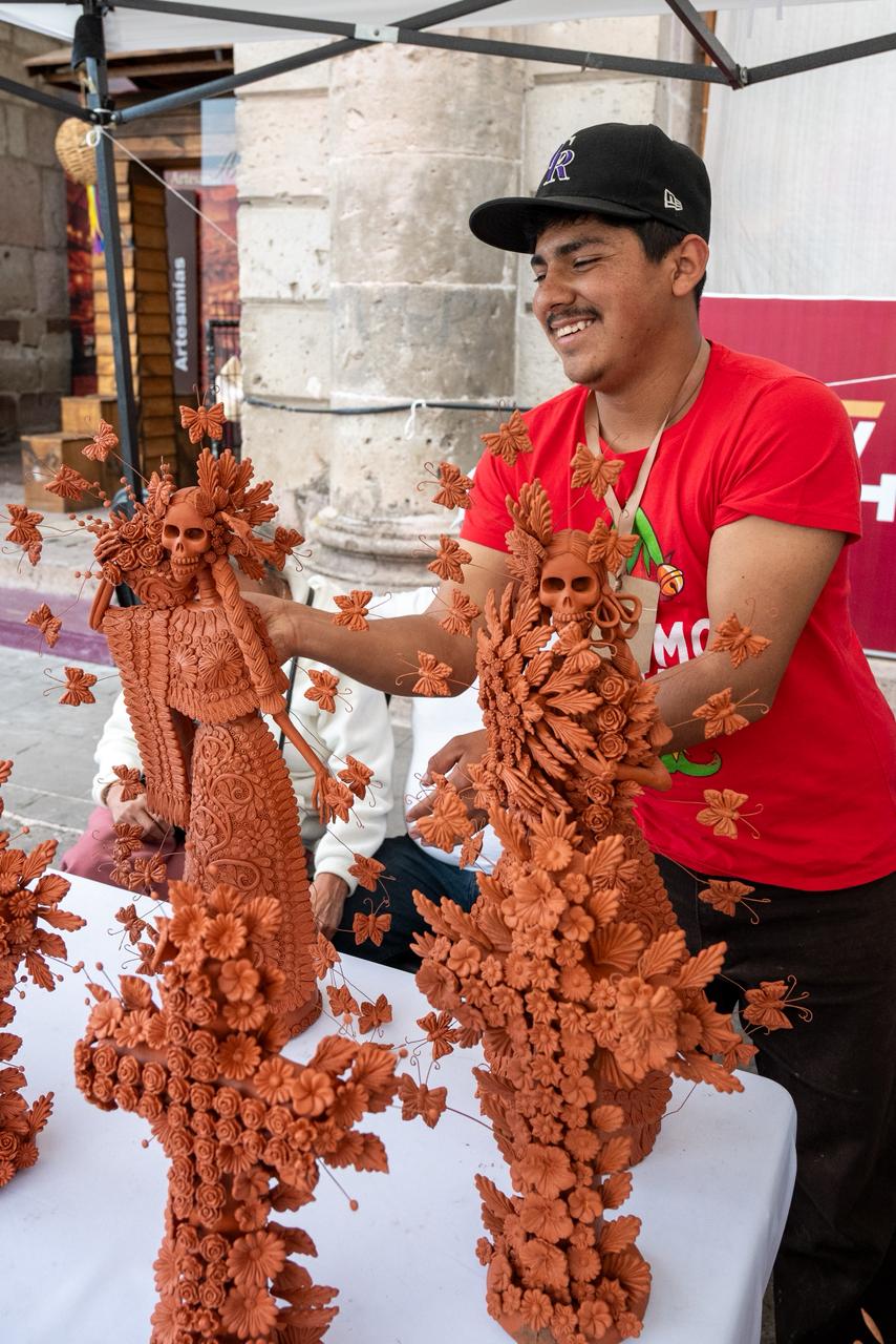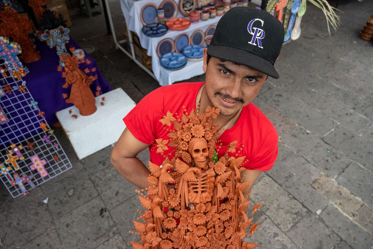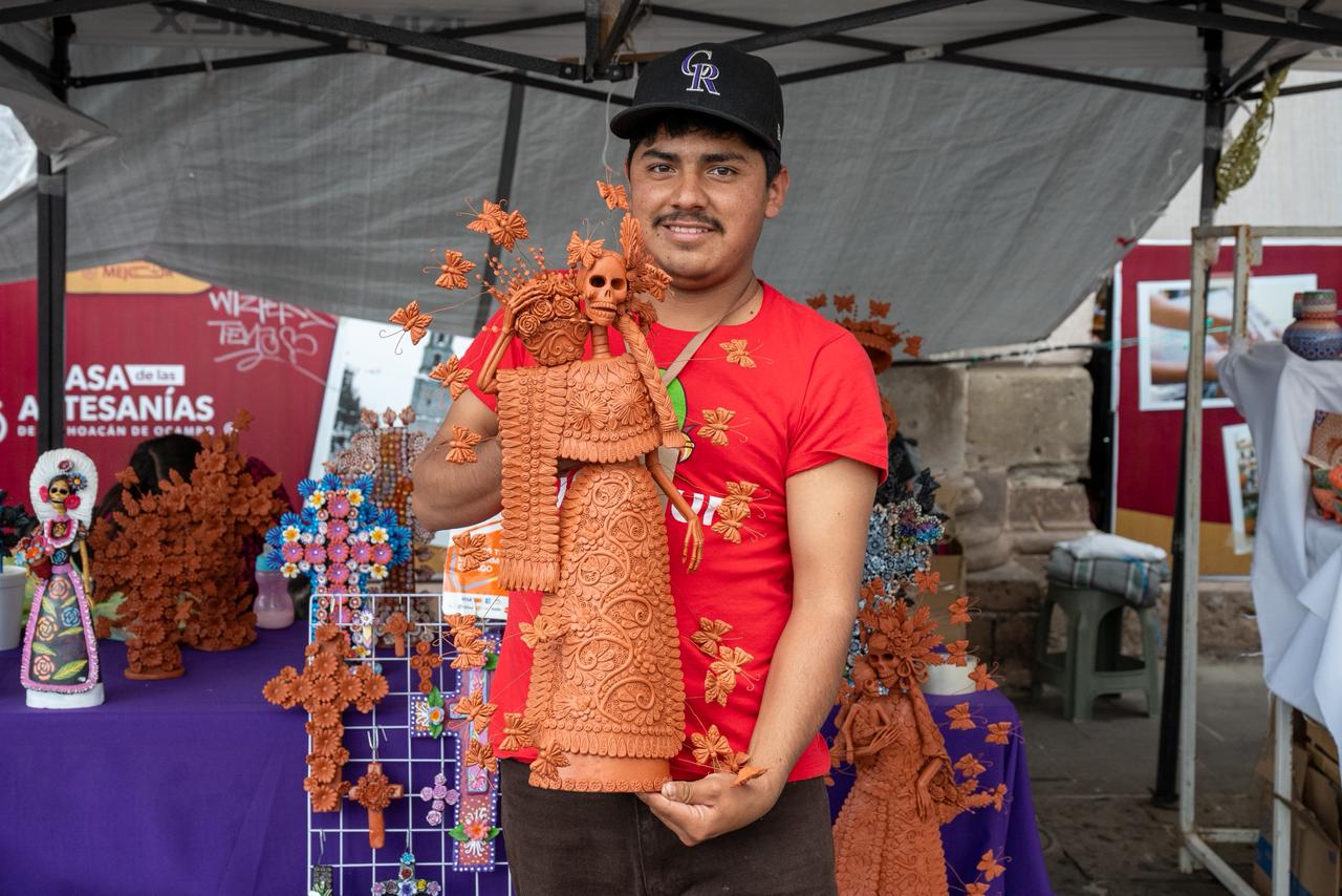 A sus 20 años, José Santiago Landa Carrillo comienza a abrirse paso en la artesanía del barro desde Capula, una de las tenencias morelianas más reconocidas por este oficio. Aunque su acercamiento no nació directamente en la elaboración de catrinas y cruces, hace dos años empezó a aprender el trabajo artesanal y este año incursionó por primera vez en la creación de cruces de barro, piezas que ahora también ofrece en Morelia.