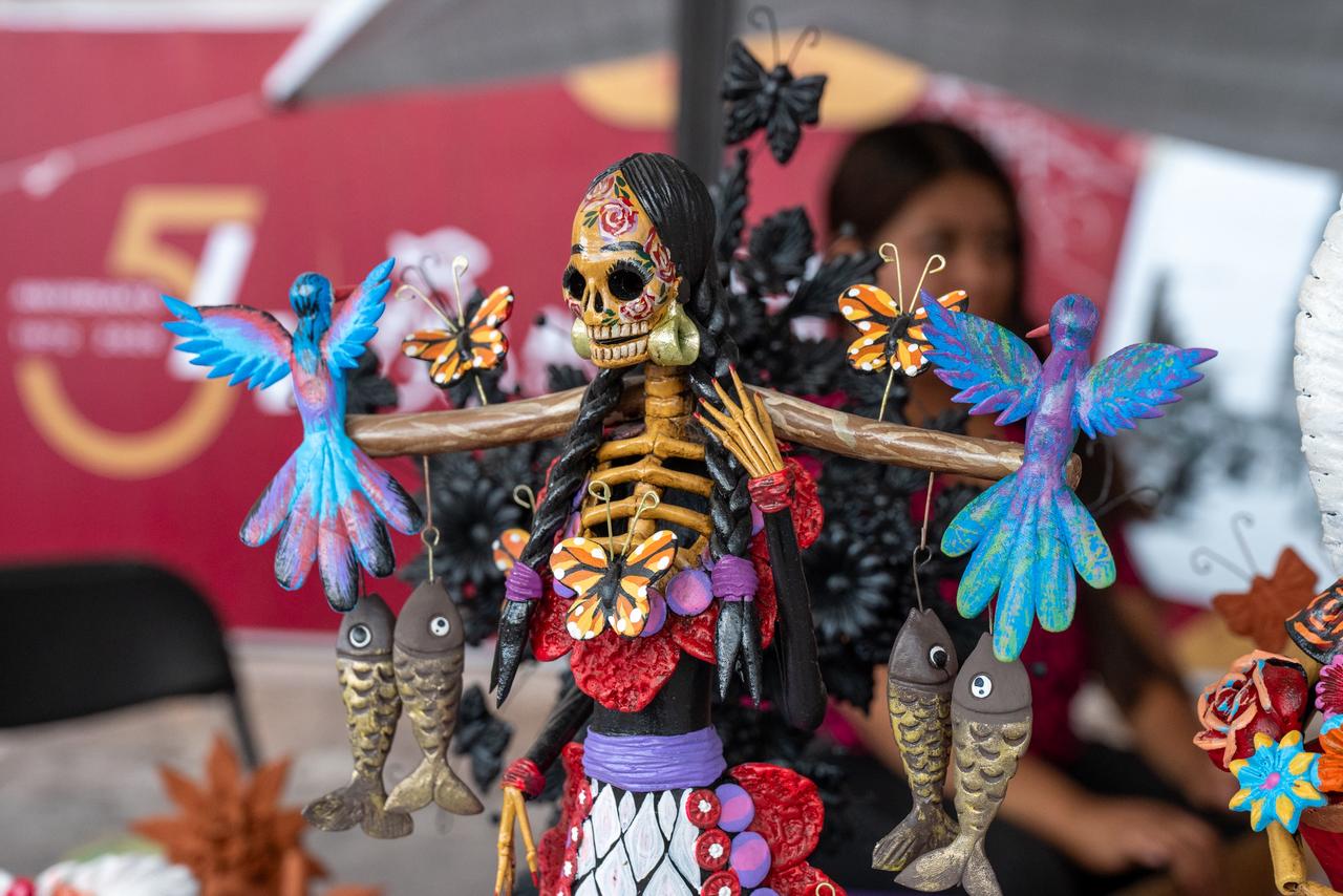 José Santiago explicó que, aunque ahora también elabora cruces, primero se formó haciendo catrinas, piezas que considera más complejas por el nivel de detalle que requieren. Por eso, dijo, si tuviera que quedarse con una sola línea de trabajo, elegiría esas figuras.