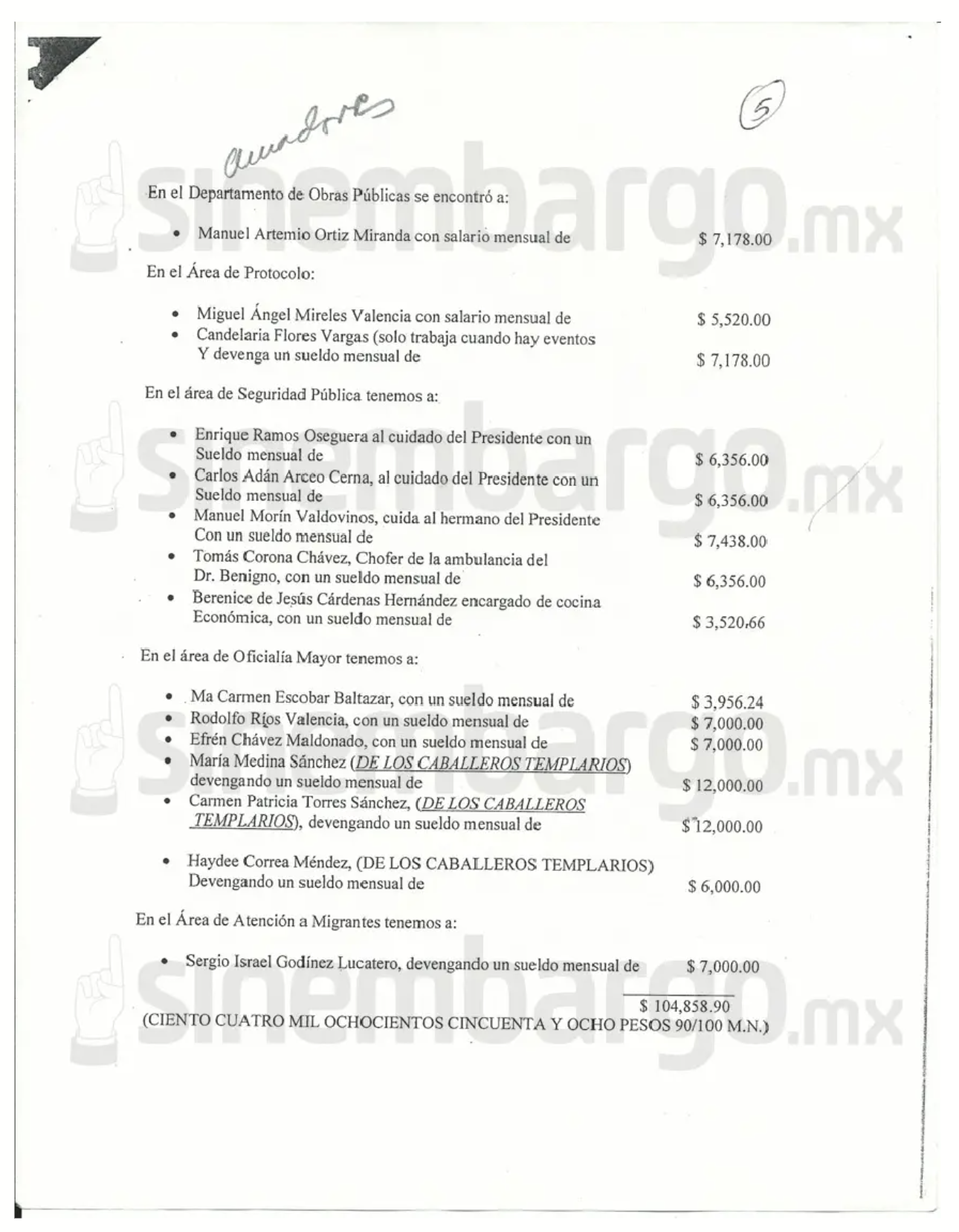 Denuncias documentadas en expedientes oficiales y revisiones de finanzas municipales señalan que el gobierno local habría pagado sueldos a familiares y allegados de presuntos integrantes de este cártel, así como a empleados sin funciones claras o “aviadores”.