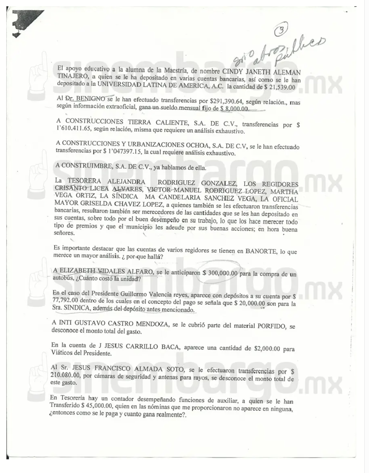 Por el contrario, informes de la Auditoría Superior del Estado emitieron constancias sin observaciones sobre el manejo financiero del municipio, salvaguardando la actuación oficial.