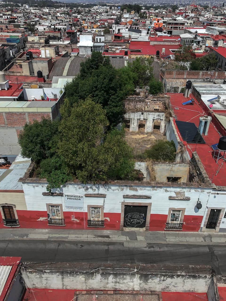 El hallazgo no siempre se percibe a nivel de calle. Desde un sobrevuelo con dron, el centro revela otra capa. Entre azoteas, cúpulas y estructuras cerradas, aparecen manchas verdes: vegetación que crece sin control dentro de casas abandonadas, formando pequeños pulmones dispersos en medio de la ciudad.